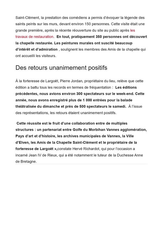 Golfe du Morbihan Vannes Agglomération, le service Pays d'Art et d'Histoire, les Archives municipales de la Ville de Vannes, Pierre Jordan, propriétaire de la Forteresse de Largoët, la Ville d'Elven, l'association les Amis de la chapelle Saint-Clément.